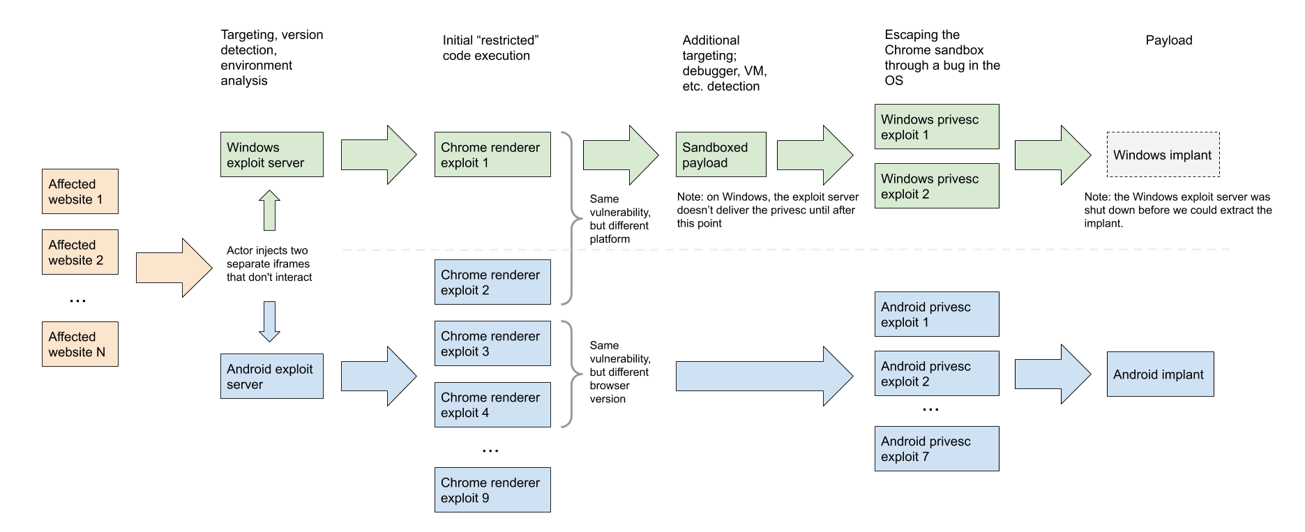 I’ve been reading some more about Google Project Zero’s “In-the-Wild Series”. Yesterday there was a great article in ZDNet by Catalin Cimpanu about their recent findings which involved a sophisticated hacking scheme that daisy-chained vulnerabilities – including 0days – together (yes, think Stuxnet) from Chrome, WIndows and Android to target both WIndows and Android devices. The operation involved two exploit servers, two sets of these vulnerability chains, and watering hole attacks. Very, very clever work that is modular, flexible, efficient and designed to escape sandboxes. When you’re dealing with a highly resourced and skilled adversary, typically backed by a nation-state, you’re looking at something like this. While you probably won’t see this coming – just ask anyone caught up in the SolarWinds attack – you can apply the lessons we’ve been learning over cumulative attacks to look past the standard checklist, and what you expect to find, to go hunt for recent changes in registry keys, files renamed, and processes diverted.