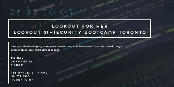 Lookout Security in Toronto is hosting an exciting event on January 12 2018 for women who are interested in  cybersecurity, and currently in the tech field.  I am honoured to have been asked to be the keynote speaker at this event. This will be my first keynote! I love that this happens with something I really care about: encouraging women in tech, specifically in cybersecurity.