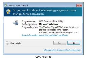 At some point, the ransomware will relaunch itself using the command “C:\Windows\system32\wbem\wmic.exe” process call create “cmd /c start %Temp%\[launched_file_name].exe”. If a user does not respond Yes to the below prompt, it will continuously display the UAC prompt.